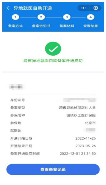 备案信息提交后,自动弹出提示页,提示备案是否成功,点击【查看备案记录】按钮,可查询异地就医备案状态。备案成功后,即时生效。